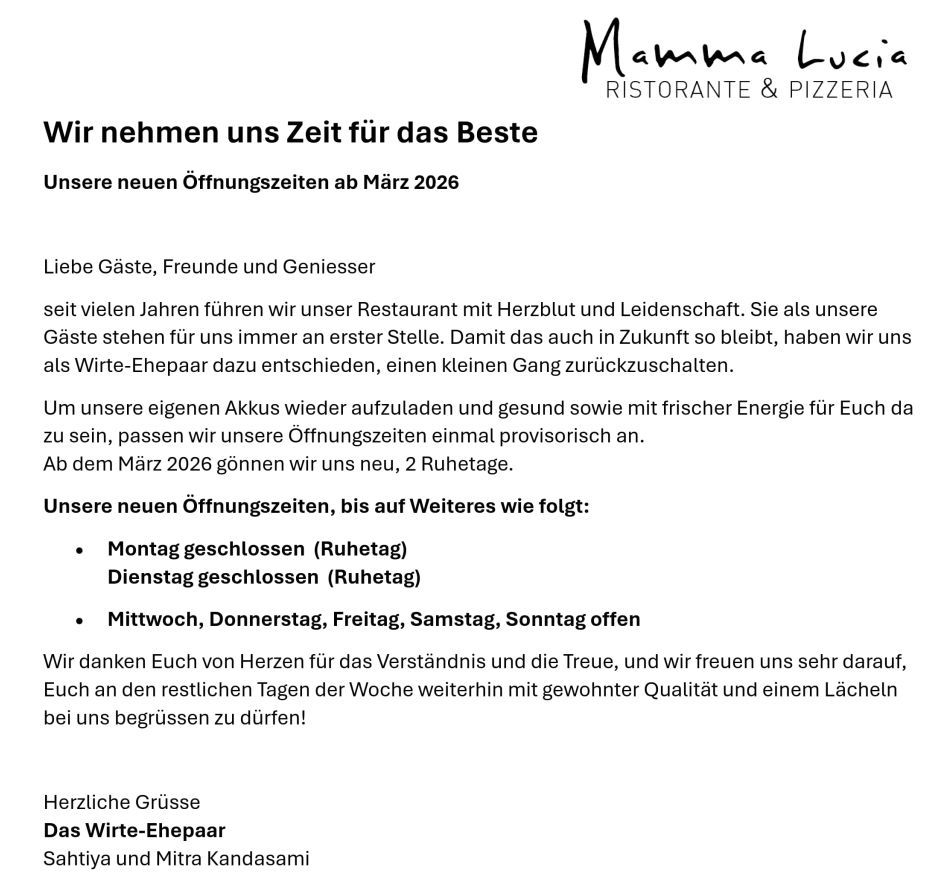 Das Ristorante Pizzeria Mamma Lucia ist bekannt für seine hausgemachten und leckeren Desserts wie z.B. saisonale Torten und Tiramisú.